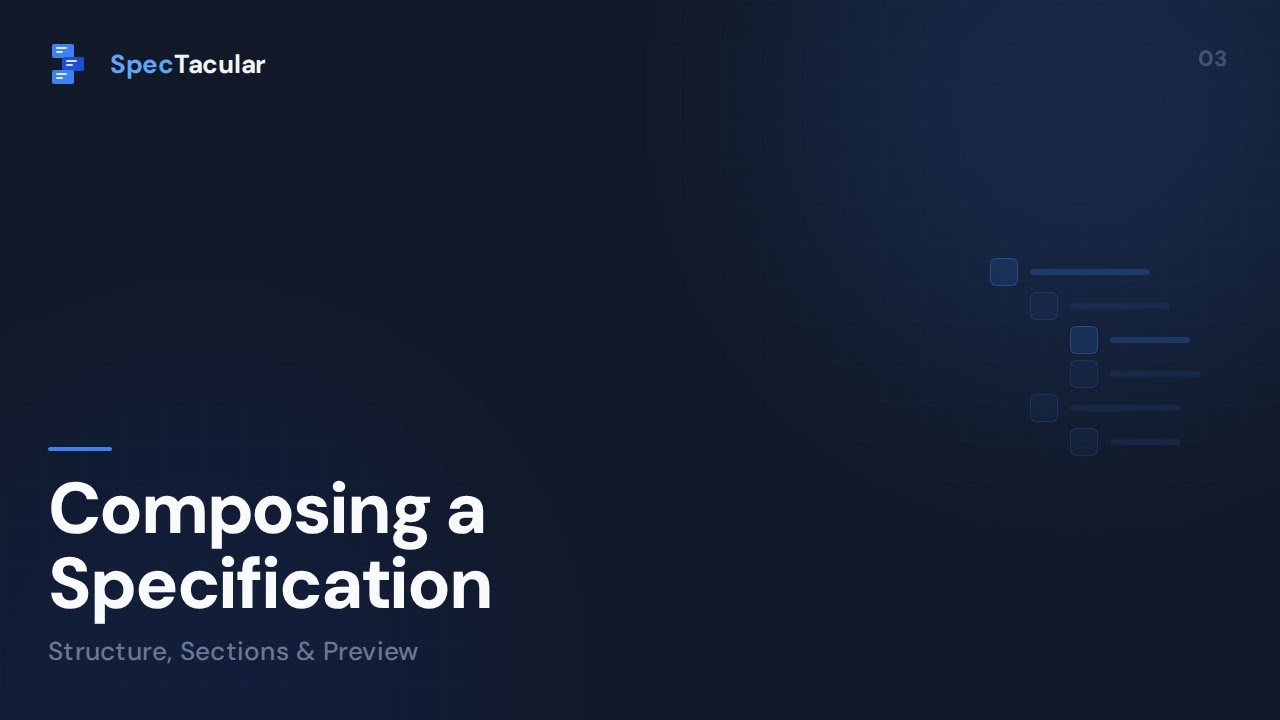 A walkthrough of SpecTacular's core interface. See how the Template Library, Projects section, Activity feed, and Dashboard work together to give your team a clear picture of every document in progress.